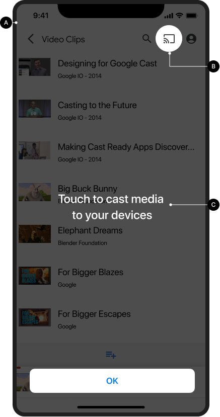 que os receptores da Web estiverem disponíveis. Para remetentes iOS, mostre uma tela de introdução ao Cast na primeira vez que o botão aparecer.