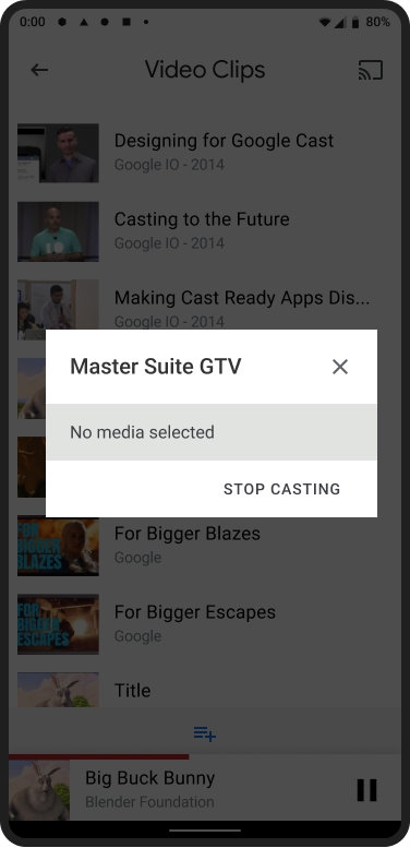 El receptor reproduce contenido y refleja su estado al usuario. El receptor debe responder de inmediato a las acciones en la app del remitente . Por ejemplo, cuando se pausa el contenido en el receptor, se muestra un ícono de pausa y, cuando el usuario presiona reproducir en la app del emisor, el receptor comienza a reproducir el contenido y quita el ícono de pausa.