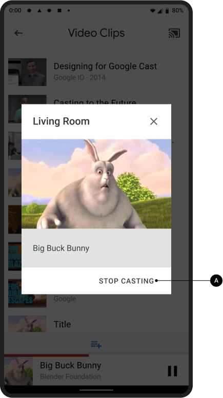 A   A bar or box that displays what's casting appears near the bottom of the sender app. These controls persist while the user browses other content or sections of the app.