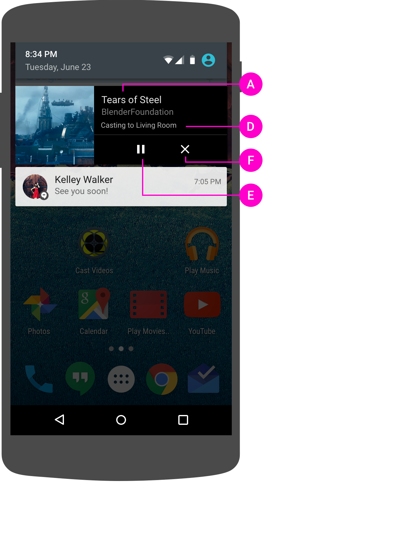 A ステータスバーの通知にアプリのアイコン(キャスト アイコンではない)を使用します。