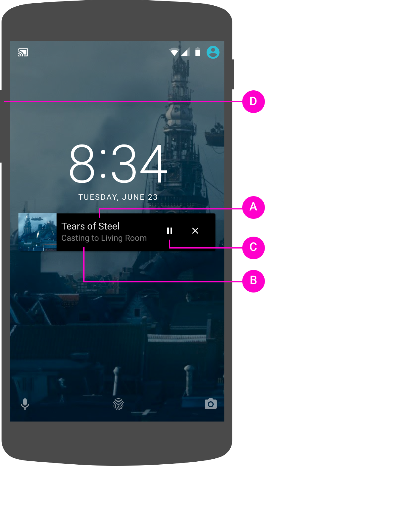 전송자 앱은 다음 영역에 Cast 제어 기능을 제공해야 합니다.