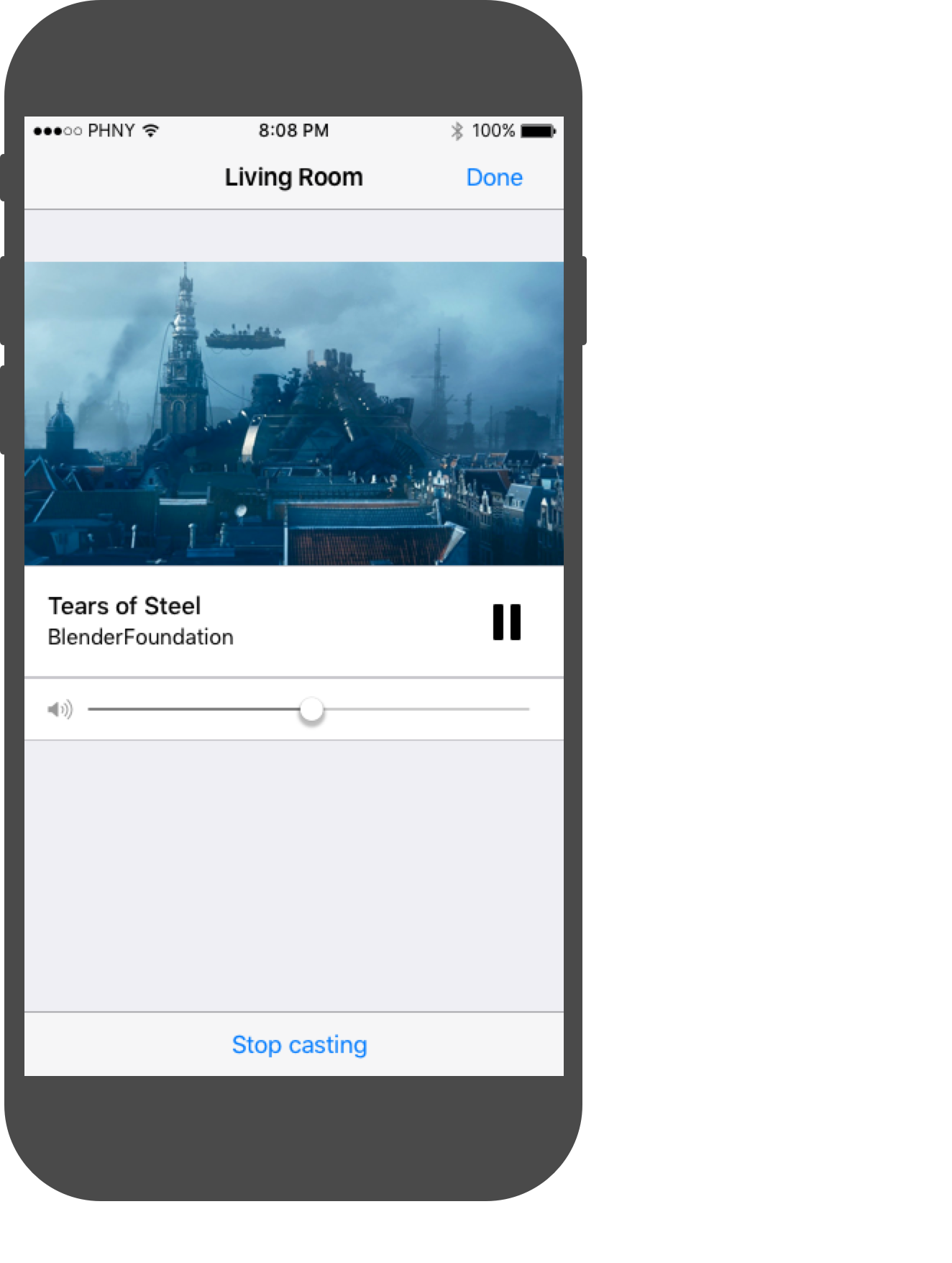 F   앱 로고, 콘텐츠 제목 또는 아트를 탭하면 전송자 앱의 확장 컨트롤러가 열려야 합니다.