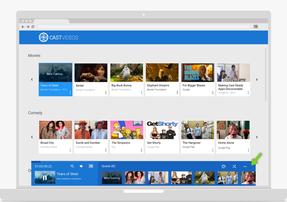 L'état de lecture Cast et les commandes de l'application émettrice dans ces zones doivent être synchronisés avec les modifications de lecture qui se produisent sur le Web Receiver, même si elles ne proviennent pas de l'application émettrice. Cela permettra de gérer correctement les commandes multi-émetteurs et le contrôle de la lecture provenant des télécommandes, des boutons, etc. de l'appareil.