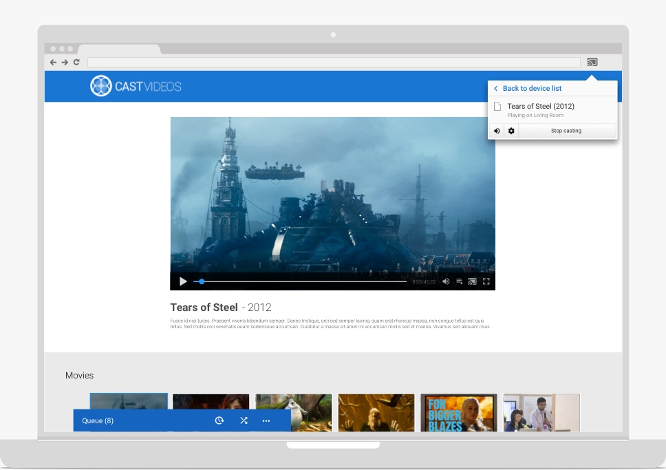 Lo stato e i controlli di riproduzione di Cast dell'app mittente in queste aree devono essere sincronizzati con le modifiche alla riproduzione che si verificano sul Web Receiver, anche se non originate dall'app mittente. Ciò consentirà la corretta gestione sia dei comandi multi-mittente sia del controllo della riproduzione proveniente dai telecomandi, dai pulsanti e così via del dispositivo.