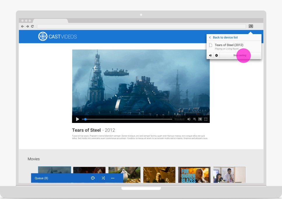 O status e os controles de reprodução do Cast do app remetente nessas áreas precisam estar sincronizados com as mudanças de reprodução que acontecem no Web Receiver, mesmo quando não são originadas pelo app remetente. Isso permite o processamento adequado de comandos de vários remetentes e do controle de reprodução dos controles remotos, botões etc. do dispositivo.