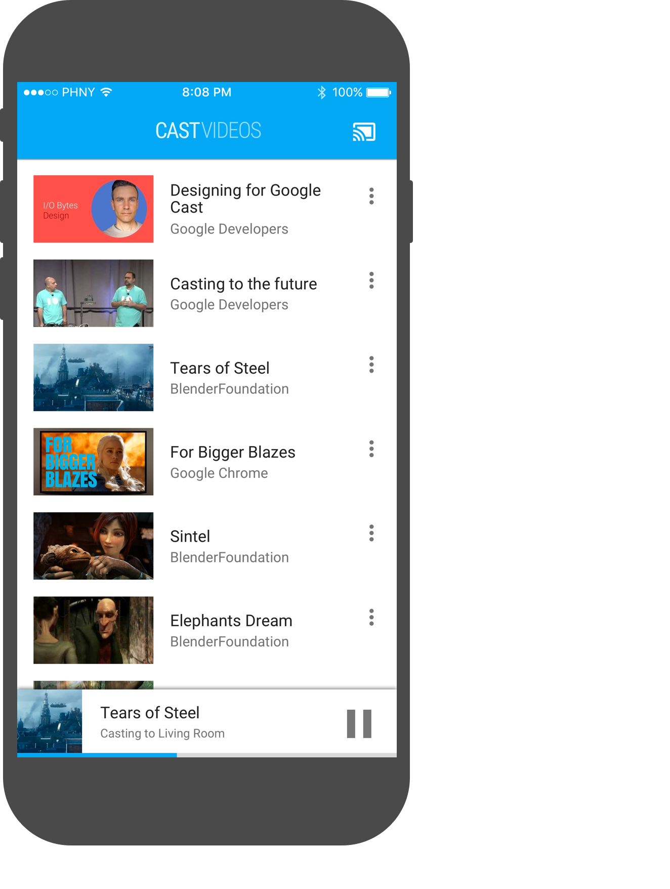 C Si l'utilisateur appuie sur le bouton Cast avant que l'expéditeur ne se reconnecte, la liste des appareils Web Receiver s'affiche. Lorsque l'utilisateur sélectionne le Web Receiver en cours de diffusion, une mini-télécommande ou une télécommande développée doit s'afficher dans l'application émettrice.