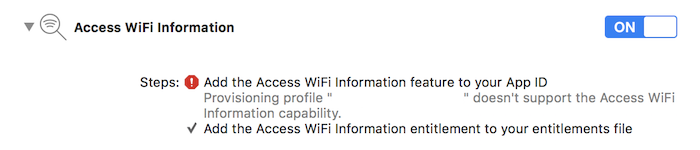 Additionally, your provisioning profile will need to support the Access WiFi Information capability. This can be added in the Apple Developer Portal.
