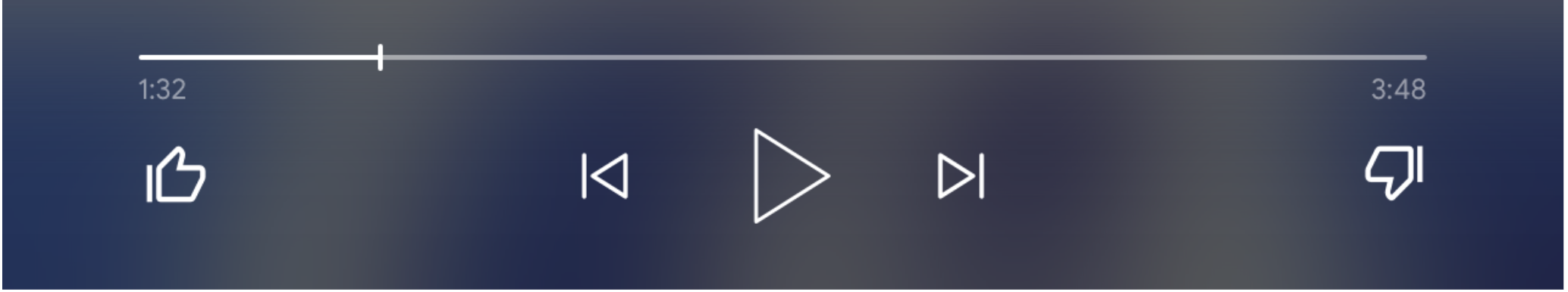 जब supportedMediaCommands की वैल्यू ALL_BASIC_MEDIA के बराबर होगी, तब डिफ़ॉल्ट कंट्रोल लेआउट इस तरह दिखेगा: