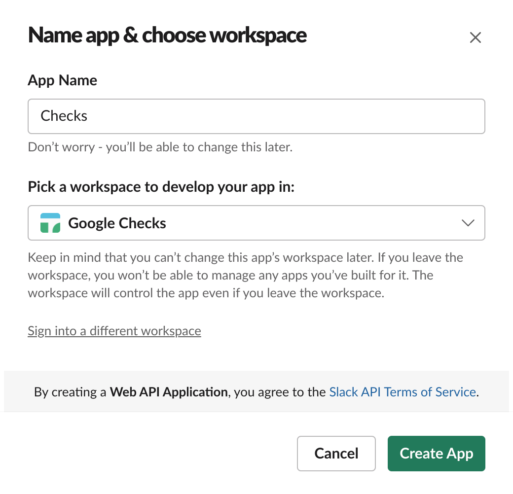 - 前往 https://api.slack.com/apps,然後按一下「Create New App」。