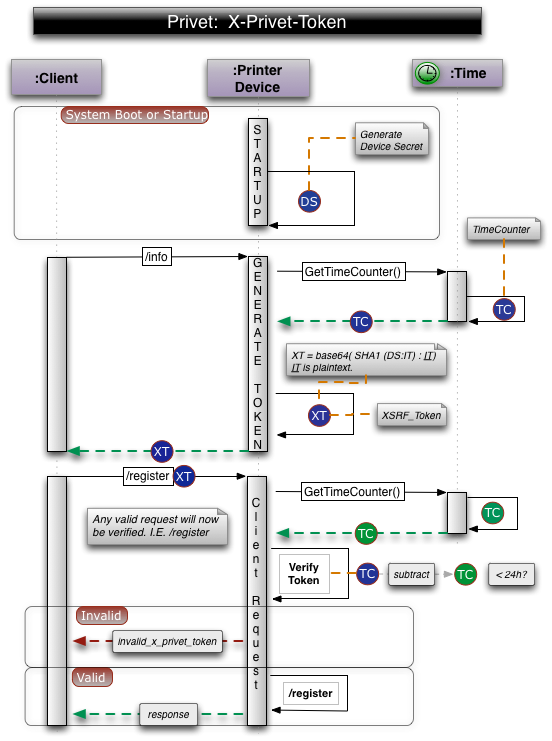 Penting: Ini adalah cara yang direkomendasikan untuk menerapkan perlindungan XSRF. Klien spesifikasi Privet tidak boleh mencoba memahami token XSRF, tetapi harus memperlakukannya sebagai blackbox. Gambar 6.2.3 mengilustrasikan cara yang direkomendasikan untuk menerapkan X-Privet-Token dan verifikasi permintaan umum.