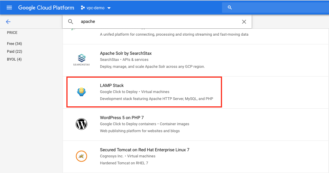 "Apache" terimini arayın. LAMP yığınını seçin. Resmi dağıtmak için tıklayın.