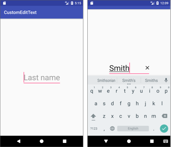 Anda dapat memperluas subclass View, seperti EditText, untuk mendapatkan tampilan kustom—pilih yang paling mendekati apa yang ingin Anda capai. Anda kemudian dapat menggunakan tampilan kustom seperti subclass View lainnya dalam satu atau beberapa tata letak sebagai elemen XML dengan atribut.