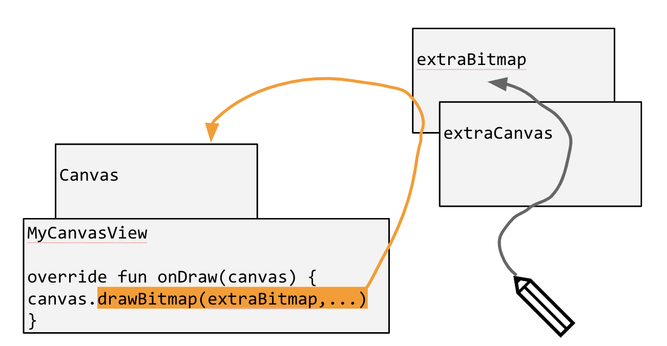 MyCanvasView, a nivel de la clase, define variables para un lienzo y un mapa de bits. LlamémoslosextraCanvasyextraBitmap. Estos son tu mapa de bits y tu lienzo para almacenar en caché lo que se dibujó antes.