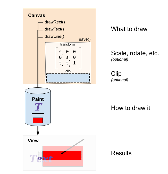 Paint. L'objetPaintcontient des informations sur le style et la couleur pour dessiner des géométries (comme des lignes, des rectangles, des ovales et des chemins d'accès) ou, par exemple, la typographie du texte. - Appliquez des transformations, telles que la translation, la mise à l'échelle ou des transformations personnalisées.