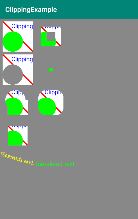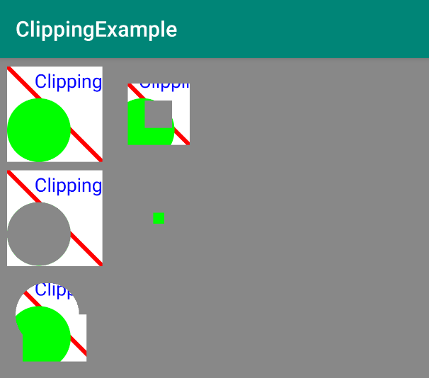 באפליקציה ClippingExample מוצג איך אפשר להשתמש בצורות ולשלב אותן כדי לציין אילו חלקים של אזור הציור יוצגו בתצוגה. האפליקציה הסופית תיראה כמו בצילום המסך שלמטה.