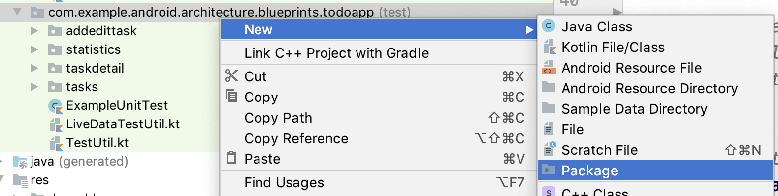 TasksFragment를 엽니다.TasksFragment클래스 이름을 마우스 오른쪽 버튼으로 클릭하고 생성, 테스트를 차례로 선택합니다. androidTest 소스 세트에서 테스트를 만듭니다.- 이 코드를