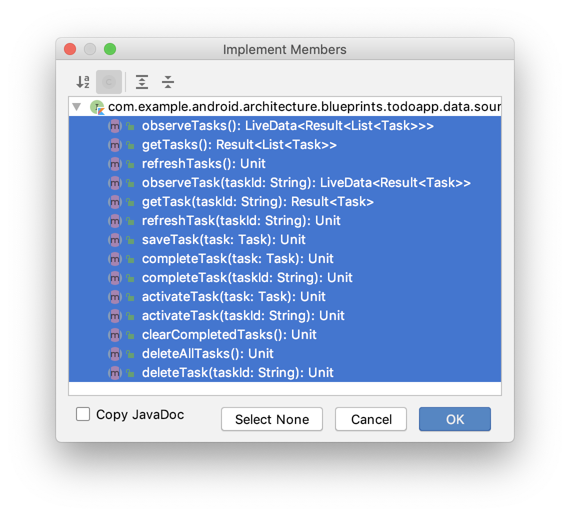 }getTasks은 저장소에 대해 실행할 수 있는 가장 '기본적인' 호출 중 하나입니다. 이 메서드에는 SQLite 데이터베이스에서 읽어오고 네트워크 호출 (updateTasksFromRemoteDataSource 호출)이 포함됩니다. 여기에는 저장소 코드보다 훨씬 많은 코드가 포함됩니다.