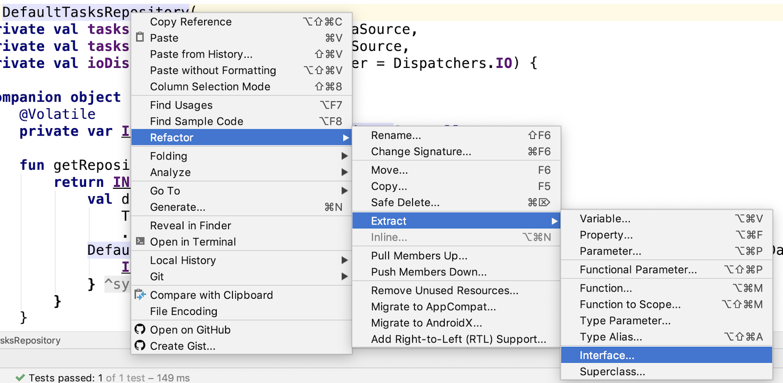 測試特定類別或類別中的程式碼可能很棘手。讓我們來看看下面這個例子。開啟 main 來源集中的 data.source.DefaultTaskRepository 類別。這是應用程式的存放區,也是您接下來要編寫單元測試的類別。
