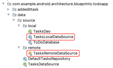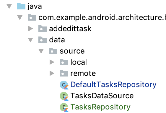 因此,DefaultTaskRepository 中的每個方法都會呼叫資料來源類別的方法,而這些方法又會呼叫其他類別中的方法,將資訊儲存至資料庫或與網路通訊。