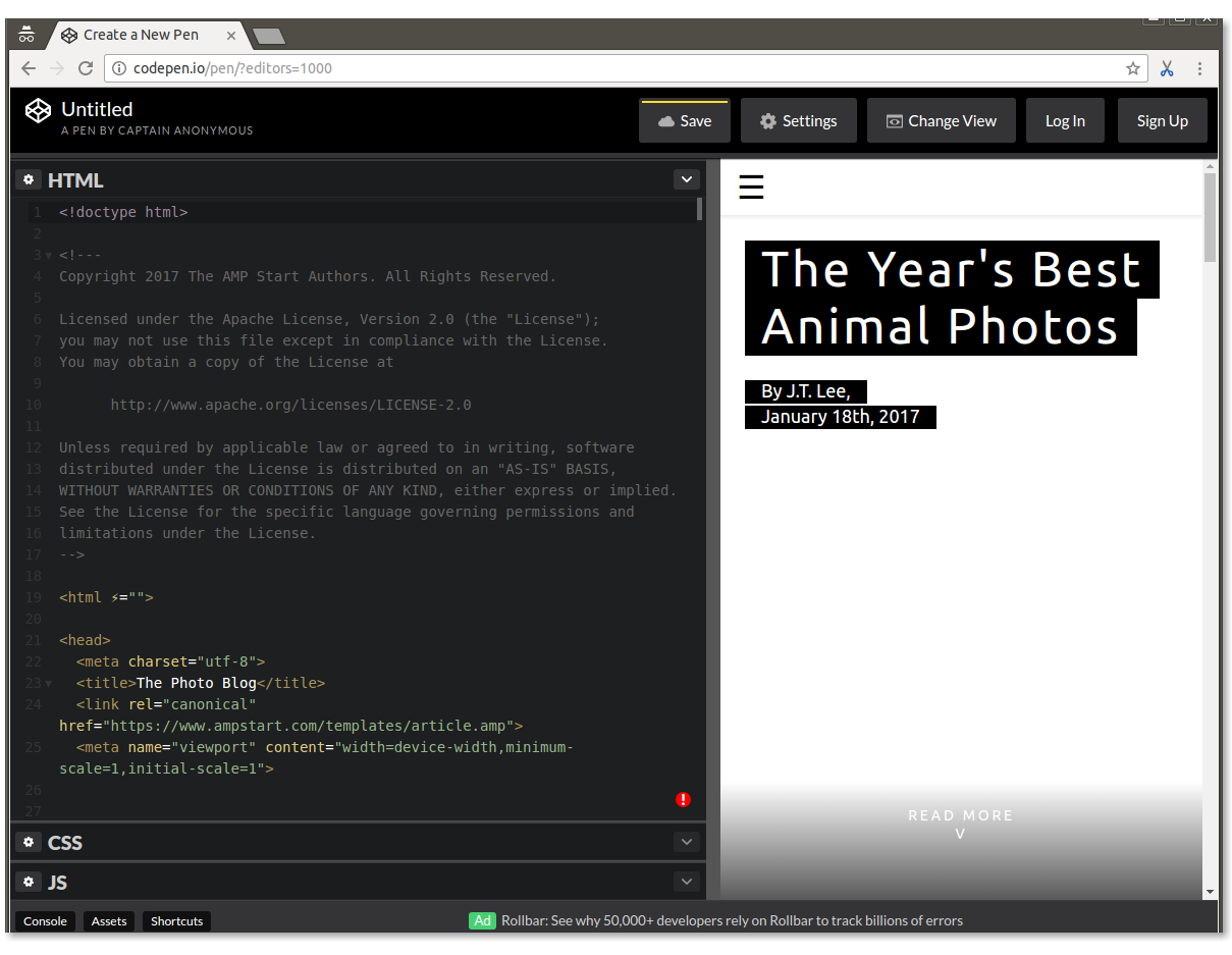 انتقِل إلى نماذج AMP ونزِّل الرمز الخاص بـ "المقالة البسيطة" لنموذج "أفضل صور حيوانات في العام".