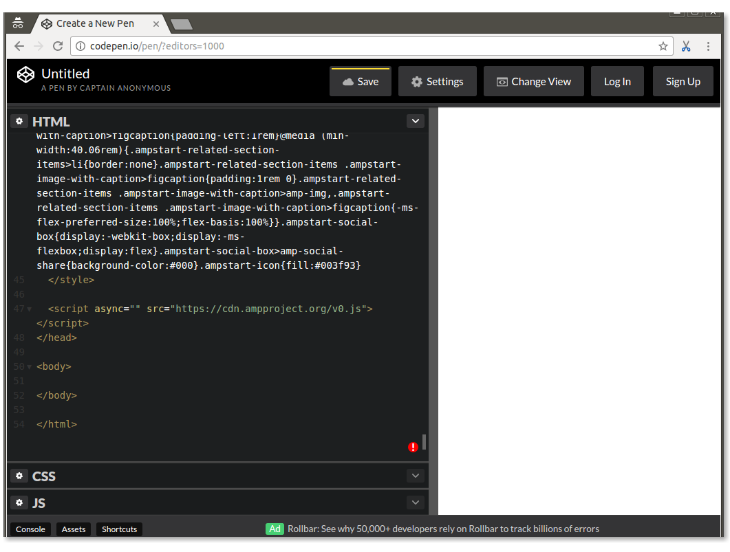 설정 중에 만든 빈 페이지의 코드를 살펴보세요. 이 페이지에는 이 상용구가 포함되어 있으며 몇 가지 추가 사항이 있습니다. 중요한 점은 축소된 CSS가 많이 포함된 <style amp-custom> 태그가 있다는 것입니다.