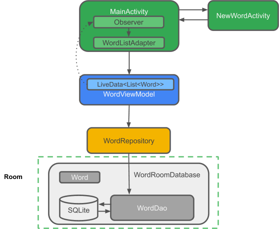 : bietet Methoden für den Zugriff auf die Datenschicht und gibt LiveData zurück, damit MainActivity die Observer-Beziehung einrichten kann.*LiveData<List<Word>>