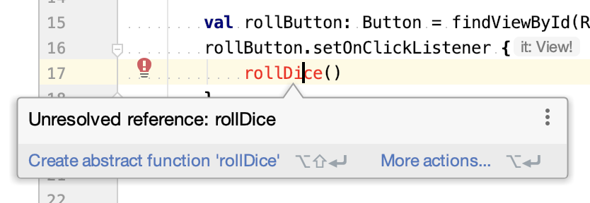 }rollDice()henüz tanımlanmadığı için Android Studio bir hata bildirir verollDice()öğesini kırmızı renkte gösterir.- İşaretçinizi