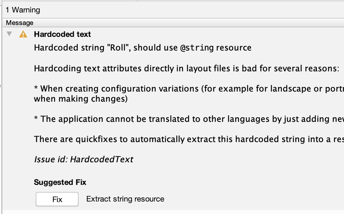 Button'nin yanında turuncu bir uyarı üçgeni görünür. İşaretçiyi üçgenin üzerine getirdiğinizde bir mesaj gösterilir. Android Studio, uygulama kodunuzda sabit kodlanmış bir dize ("Roll") algıladı ve bunun yerine dize kaynağı kullanmanızı öneriyor.