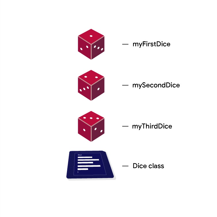 จากคลาสนั้น คุณจะสร้างออบเจ็กต์ลูกเต๋าจริงได้ ซึ่งเรียกว่าอินสแตนซ์ออบเจ็กต์ เช่น คุณสามารถสร้างลูกเต๋า 12 ด้านหรือลูกเต๋า 4 ด้าน
