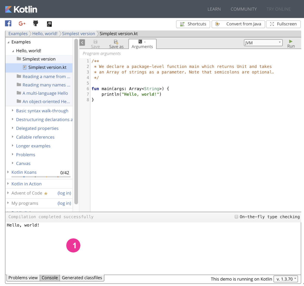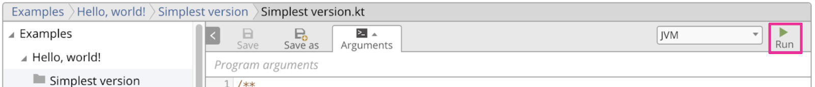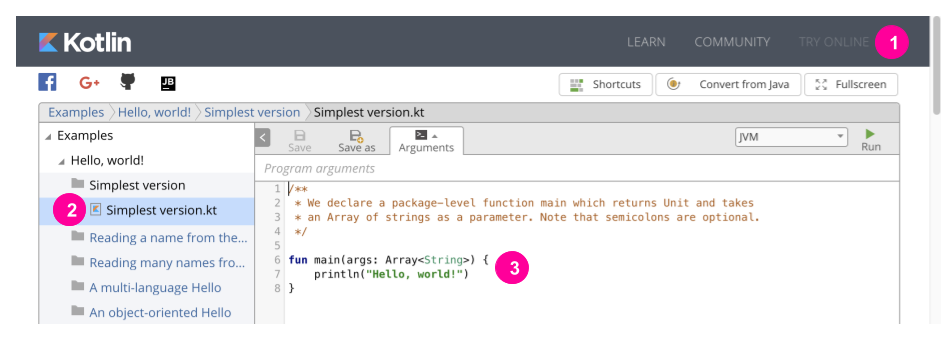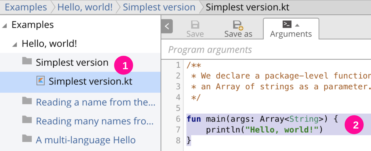 - 在文件浏览器中,选择 Examples > Hello, world! > 最简单版本 > SimplestVersion.kt(下图中的 1)。