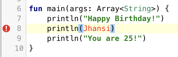 显示为红色,并且在代码的第 8 行旁边有一个感叹号,提醒您这里有错误。