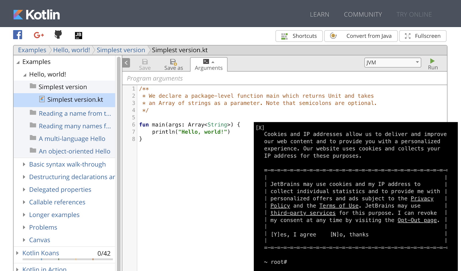 - 在浏览器中,打开 https://try.kotlinlang.org/。这将打开一个基于浏览器的编程工具。