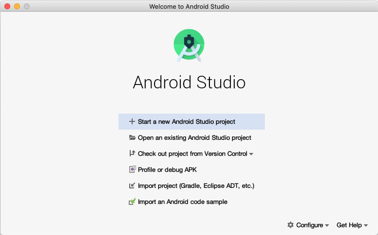 - في نافذة أهلاً بك في "استوديو Android"، انقر على + بدء مشروع جديد في "استوديو Android".