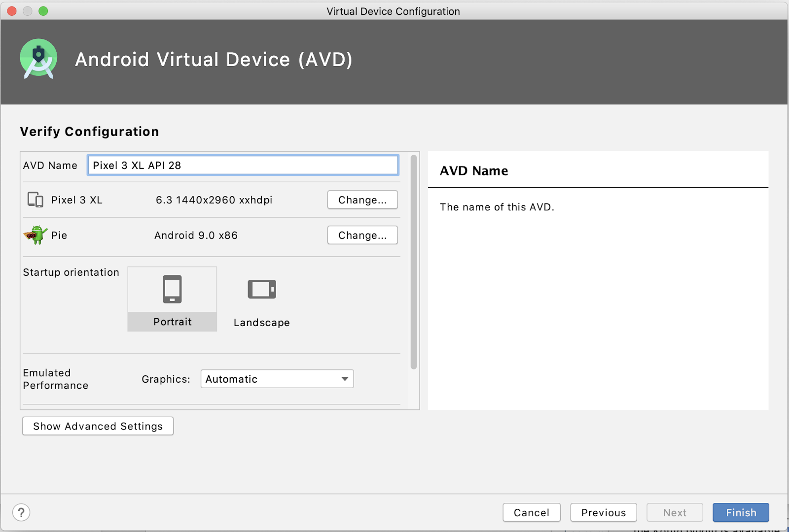 يتم عرض نافذة جهاز Android الافتراضي (AVD)، حيث يمكنك اختيار تفاصيل إعدادات إضافية لجهازك.