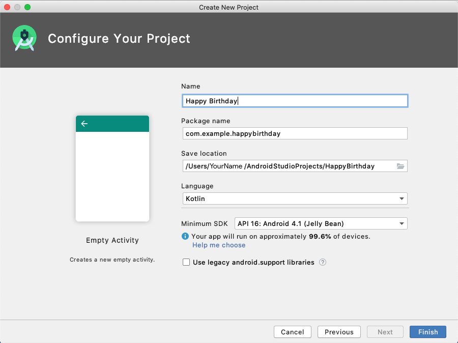ב-codelab הזה תיצרו את אפליקציית Android הראשונה שלכם (Happy Birthday) על סמך תבנית לאפליקציה בסיסית שסופקה על ידי Android Studio. בנוסף, תלמדו איך נראה פרויקט Android ואיך משתמשים בחלונות שונים ב-Android Studio.