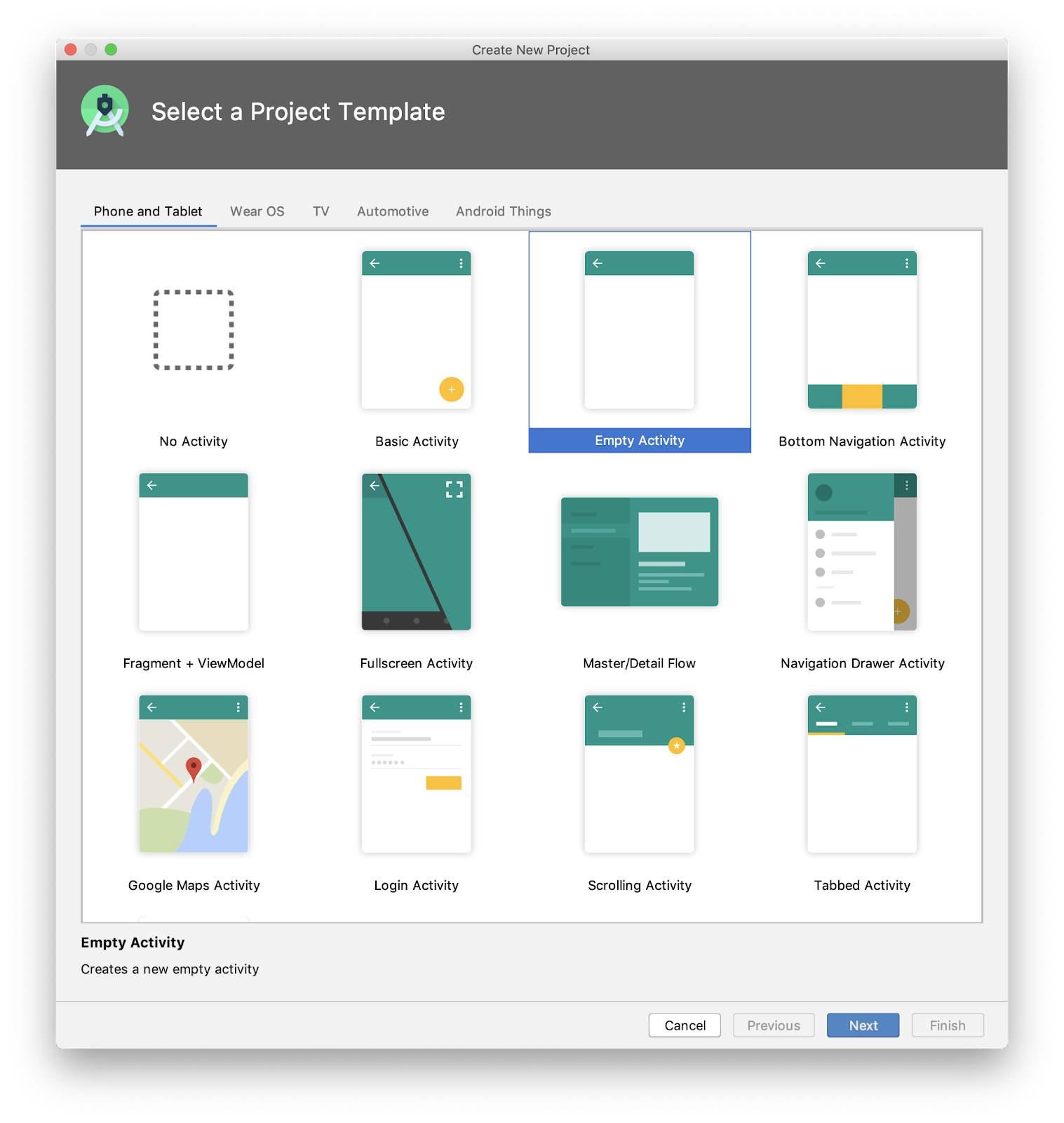- Ở trên cùng của dòng, nhấp vào mẫu Empty Activity (Hoạt động trống) để chọn mẫu đó làm mẫu cho dự án.