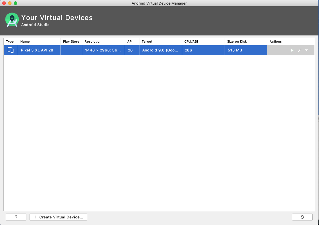 Thiết bị ảo mới sẽ hiển thị trong cửa sổ Your Virtual Device (Thiết bị ảo của bạn) và sẵn sàng để sử dụng.