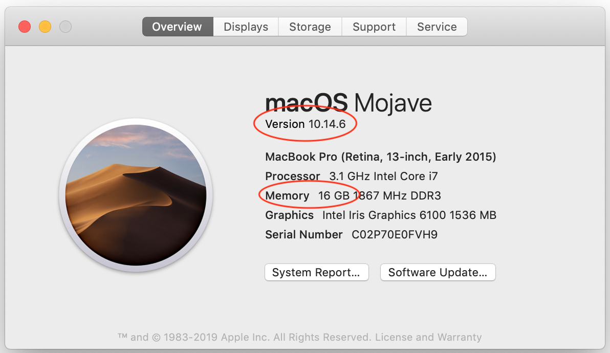 Örneğin, aşağıdaki ekran görüntüsünde işletim sistemi sürümü 10.14.6 ve bellek 16 GB'tır.