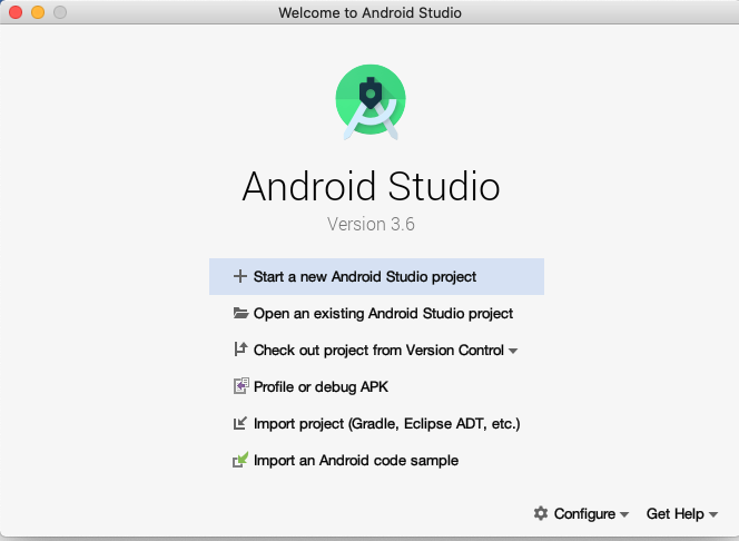 Android Studio'ya Hoş Geldiniz iletişim kutusu gösterilir ve uygulama oluşturmaya başlayabilirsiniz.