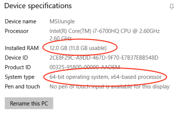 - Yüklü RAM'in en az gerekli miktarda olduğundan ve Sistem Türü'nün işletim sisteminin 64 bit sürümü olduğundan emin olun.
