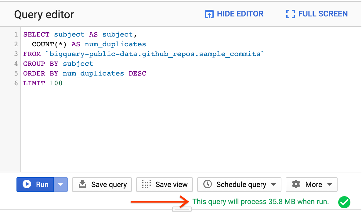 Como o conjunto de dados do GitHub é grande, é útil usar um conjunto de dados de amostra menor enquanto você faz testes para economizar custos. Use os bytes processados abaixo do editor para estimar o custo da consulta.