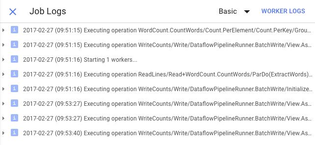 আপনার পাইপলাইন চালানোর কম্পিউট ইঞ্জিন দৃষ্টান্তগুলির জন্য কর্মী লগগুলি দেখতে আপনি লগ ট্যাবে কর্মী লগ বোতামটি ব্যবহার করতে পারেন। কর্মী লগগুলি আপনার কোড দ্বারা উত্পন্ন লগ লাইন এবং এটি চালানোর ডেটাফ্লো জেনারেটেড কোড নিয়ে গঠিত।