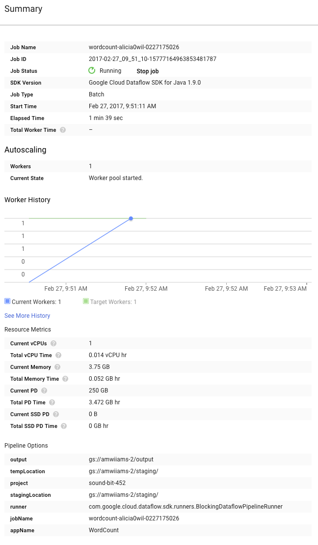 Google ক্লাউড প্ল্যাটফর্ম কনসোলে ক্লাউড ডেটাফ্লো মনিটরিং UI খুলুন। রানিং- এর স্ট্যাটাস সহ আপনার ওয়ার্ডকাউন্টের কাজ দেখতে হবে: