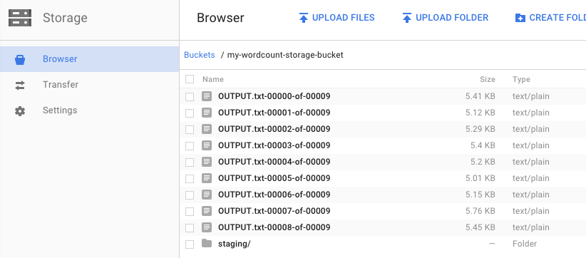 Ricordi quando hai eseguito la pipeline e hai specificato un bucket di output? Diamo un'occhiata al risultato (perché non vuoi vedere quante volte compare ogni parola in Re Lear?). Torna al browser Cloud Storage nella console Google Cloud. Nel bucket dovresti vedere i file di output e di staging creati dal job: