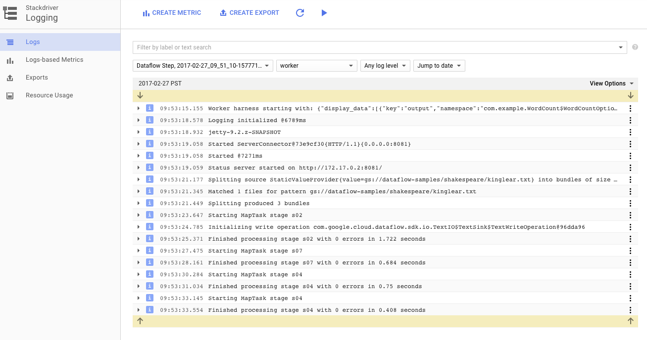 Ardışık düzeninizi çalıştıran Compute Engine örneklerinin çalışan günlüklerini görüntülemek için günlükler sekmesindeki Çalışan Günlükleri düğmesini kullanabilirsiniz. Çalışan günlükleri, kodunuz tarafından oluşturulan günlük satırlarından ve kodu çalıştıran Dataflow tarafından oluşturulan koddan oluşur.