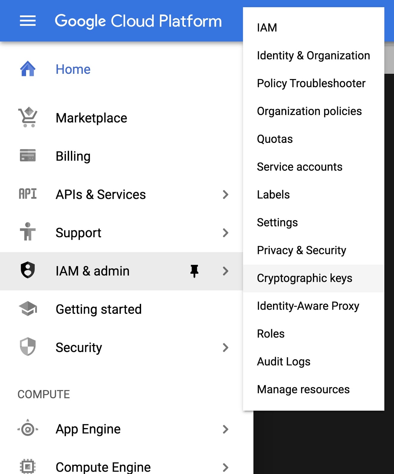 暗号鍵のウェブ UI を開き、新しく作成されたリソースを表示します。これは、メインメニューの [IAM と管理] で確認できます。