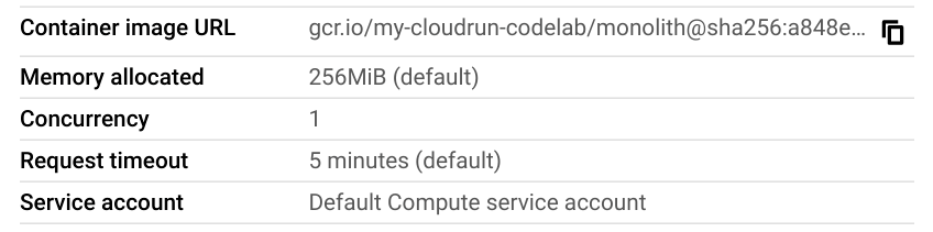 gcloud run deploy --image=gcr.io/${GOOGLE_CLOUD_PROJECT}/monolith:1.0.0 --platform managed --concurrency 1Beantworten Sie die nachfolgenden Fragen wie beim ersten Mal. Wenn der Befehl ausgeführt wurde, können Sie sich das Ergebnis in der Cloud Console ansehen.
