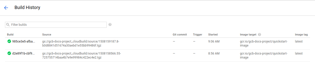 ----------------------------------------------------------------------------------------------------------------------------------------------------------------------------------------------------------- ID CREATE_TIME DURATION SOURCE IMAGES STATUS 1ae295d9-63cb-482c-959b-bc52e9644d53 2019-08-29T01:56:35+00:00 33S gs://<PROJECT_ID>_cloudbuild/source/1567043793.94-abfd382011724422bf49af1558b894aa.tgz gcr.io/<PROJECT_ID>/monolith:1.0.0 SUCCESS