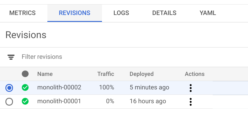 gcloud run deploy --image=gcr.io/${GOOGLE_CLOUD_PROJECT}/monolith:1.0.0 --platform managed --concurrency 80Observa que se creó otra revisión, se redireccionó el tráfico y se restableció la simultaneidad en 80.