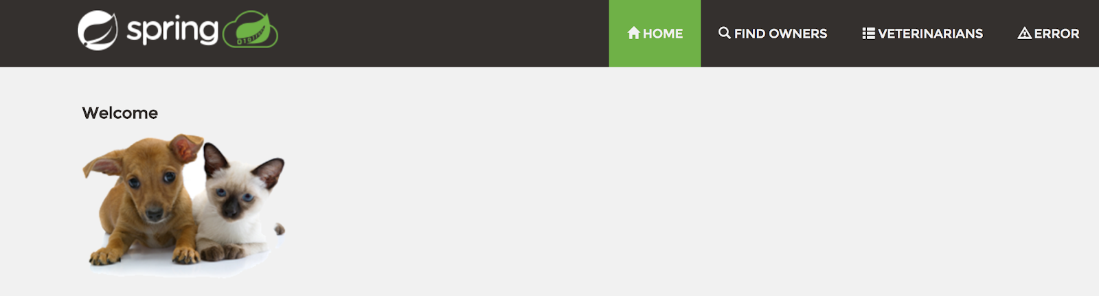瀏覽器中應該會顯示 Petclinic 首頁,如下所示: